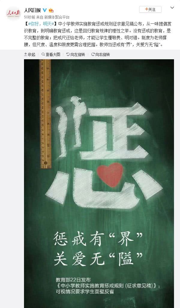 对于教育部发布的征求意见稿,人民日报也是发文评论称,没有惩戒的教育,是不完整的教育。教师当惩戒有“界”,关爱方无“隘”。