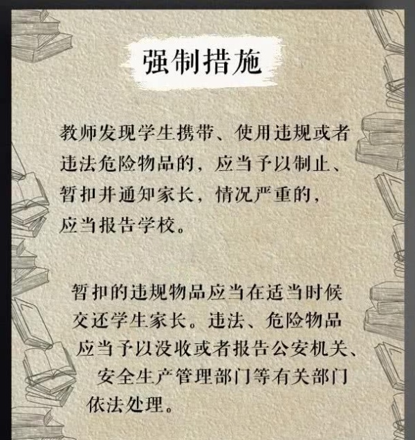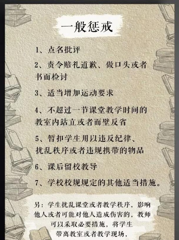 当然,为了公平对待,老师们同样也不能有出格的教育惩戒行为。说白了也就是说不能打、不能骂、不能罚抄课文一百遍等等。