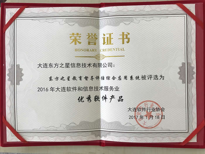 年会还公布了大连市软件和信息技术服务业年度“三名”评选结果,表彰了多个优秀奖项及12个优秀软件产品,我公司自主研发的《东方之星教育督导评估综合应用系统》荣获2016年度优秀软件产品的称号。