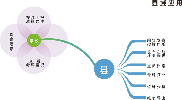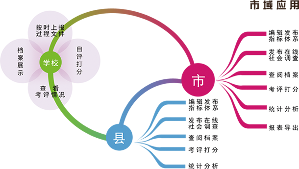 督导评估:市对区或学校进行督导评估、区自评及对学校督导评估、学校自评、社会人员参与辅助评估等功能。