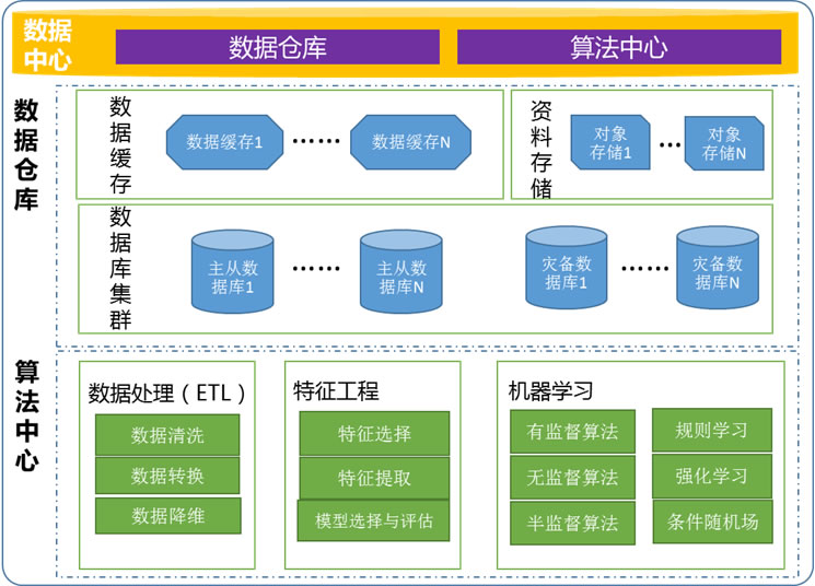 开放式平台架构设计。通过业务平台、算法中心和数据中心提供如下服务:共享服务、数据处理(ETL)、特征工程、机器学习、数据缓存、资料存储、数据库集群和小工具等。