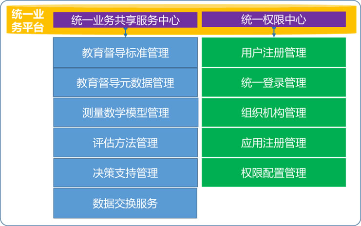 统一教育督导业务平台,实现全系统应用群所用应用模块的统一用户注册管理、统一登录管理、组织机构管理、应用注册管理和权限配置服务。